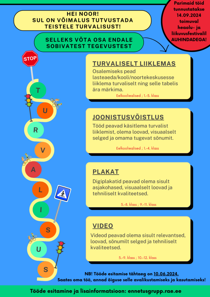 Videovõistlus – osalejad saavad luua lühikesi videoklippe, mis rõhutavad turvalise liiklemise olulisust. Ootame osalema kõiki koole.